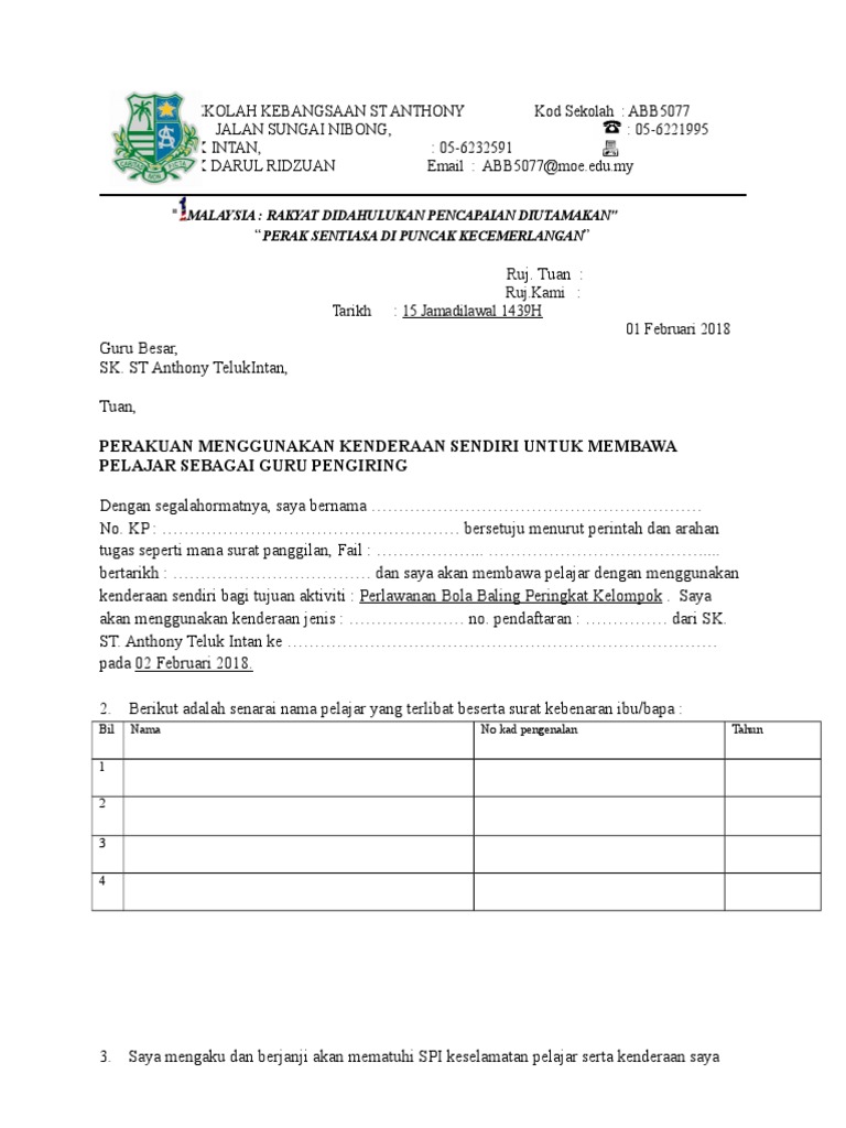 For more information and source, see on this link : Surat kebenaran menggunakan kenderaan sendiri membawa murid. Tuan, perakuan menggunakan kenderaan sendiri untuk membawa pelajar sebagai guru pengiring dengan segala hormatnya, saya bernama joe bin joel no.kp : Borang kebenaran menggunakan kenderaan sendiri guru. Jadi untuk membuat tuntutan elaun kenderaan, dokumen utama yang perlu ada ialah surat akuan atau surat kebenaran daripada pemilik kenderaan(jika kenderaan tu bukan atas nama orang yang nak menuntut) dan greencard atau surat hak milik kenderaan (yang warna pink).contoh kad bawah kalau org yg tak tahu rupa greencard. Pelajar tidak dibenarkan menggunakan kenderaan awam kecuali perkhidmatan penerbangan. Kampung hutan setali, mukim tunjang 06000 jitra, kedah darul aman. Butiran pemohon nama pegawai jawatan jabatan/unit gred gaji rm jenis kenderaan no. Perakuan saya mengesahkan bahawa amat mustahak dan penting bagi pegawai ini menjalankan tugas rasmi / menggunakan kenderaan sendiri dan dibenarkan : Surat kebenaran menggunakan kenderaan sendiri kpm. Saya yang bertanda tangan di bawah ini, nama : For more information and source, see on this link : Surat kebenaran menggunakan kenderaan sendiri untuk membawa murid atau pelajar menyertai aktiviti luar sama ada kokurikulum koakademik mtaq dan pelbagai aktiviti luar lagi.